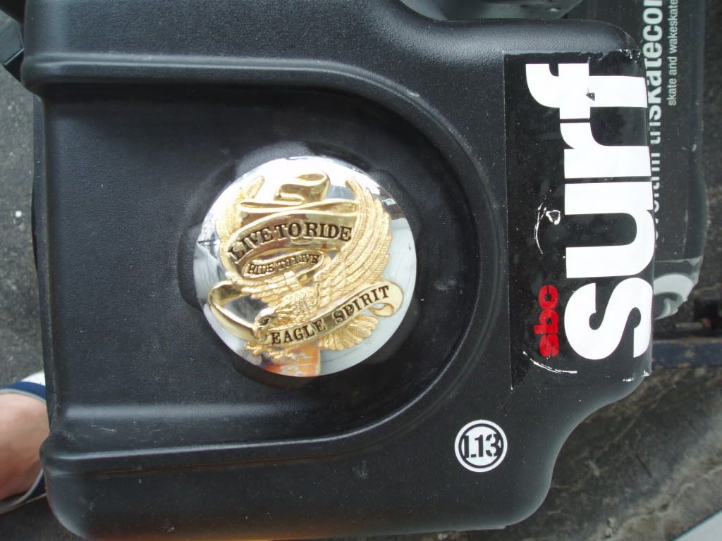 I was just out grinding down my fins and I snapped a shot of the new skate and my winch with the baller new gas cap. The cap is like 15 or more years old and from a chopper shop my bro used to work at.