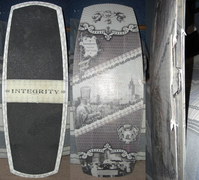 I'm not sure if this has been a thread before but I know that there are plenty of people here with some wakeskates that they either used to ride or are currently riding that got wrecked either once and were retired or continually and getting worse so let's see them!