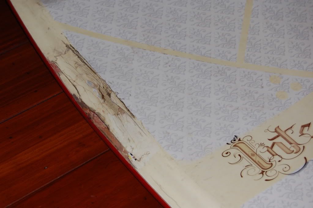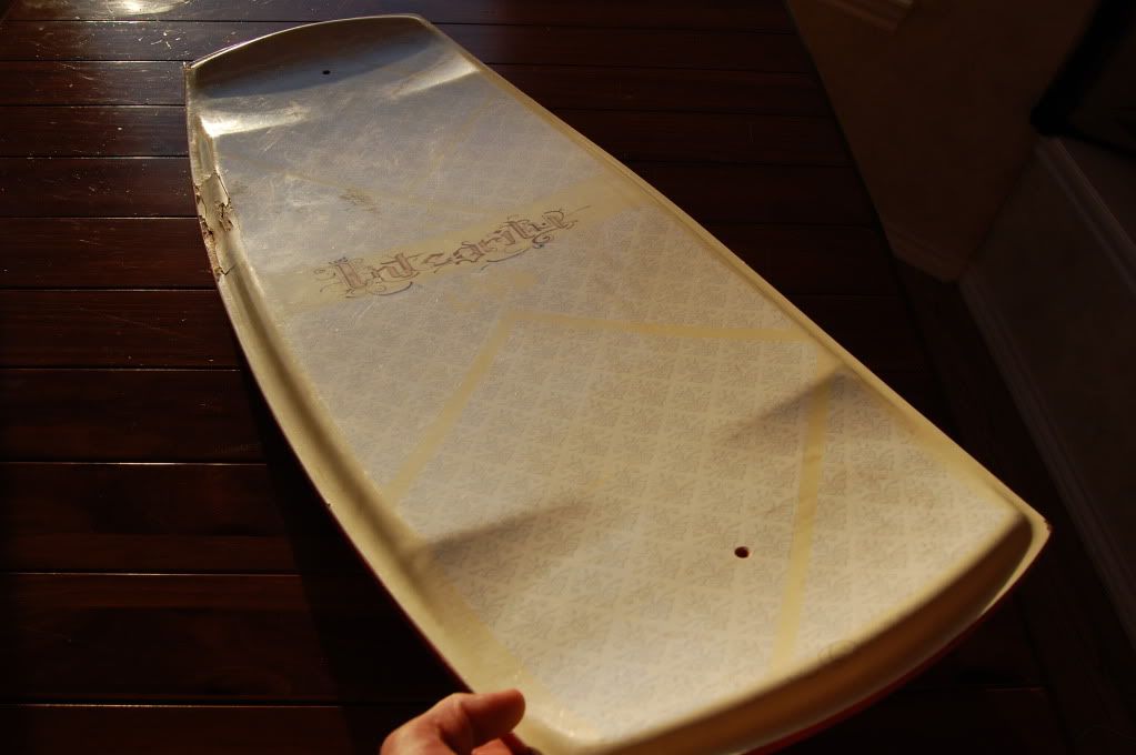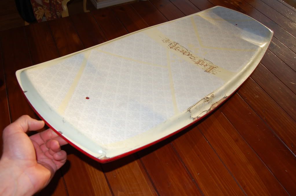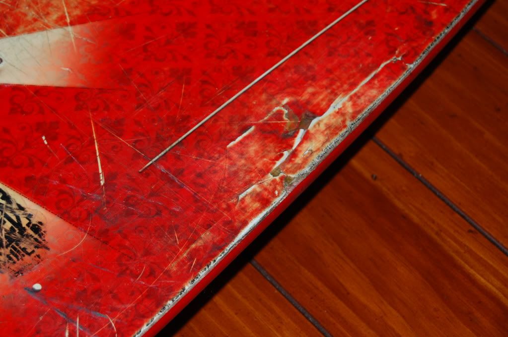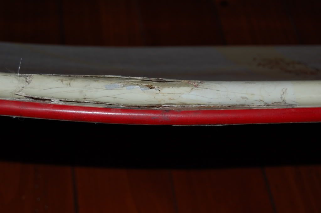 As you can see in the pics, the side wall got banged up and busted open. This is definitely repairable with some fiber glass matting, resin, and some stickers/ griptape to seal it up. With some TLC this board still has plenty of life left in it.