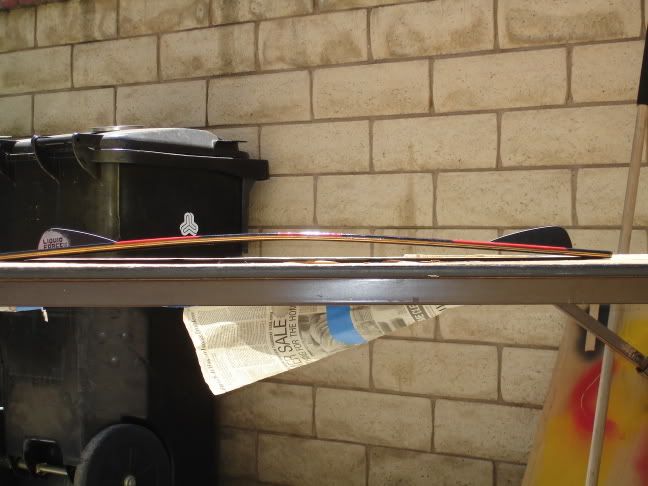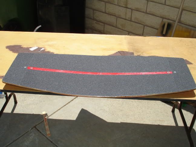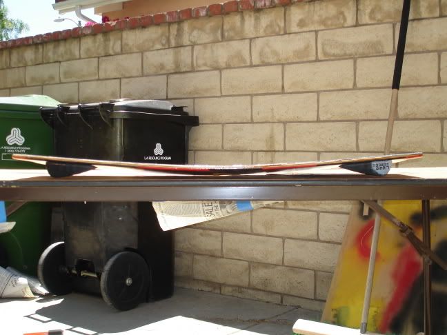 Hey guys im new to wakeskating and this forum. I asked my dad if I could buy a wakeskate and he told me I couldnt. So.. I built one. I'm giving it a run on sunday to see how it rides and ill give ya'll the word. So heres a few pics on my new skate. It took me aproximatly 3 weeks cuz I had to go to school, normally woulda taken 1-2 weeks. I used a different method on getting a rocker then normally so i hope you guys like it. So heres my pics. I hope to get some feedback and comments plzz. oh and those are 1.5 inch liquid force wakeskate fins.  |