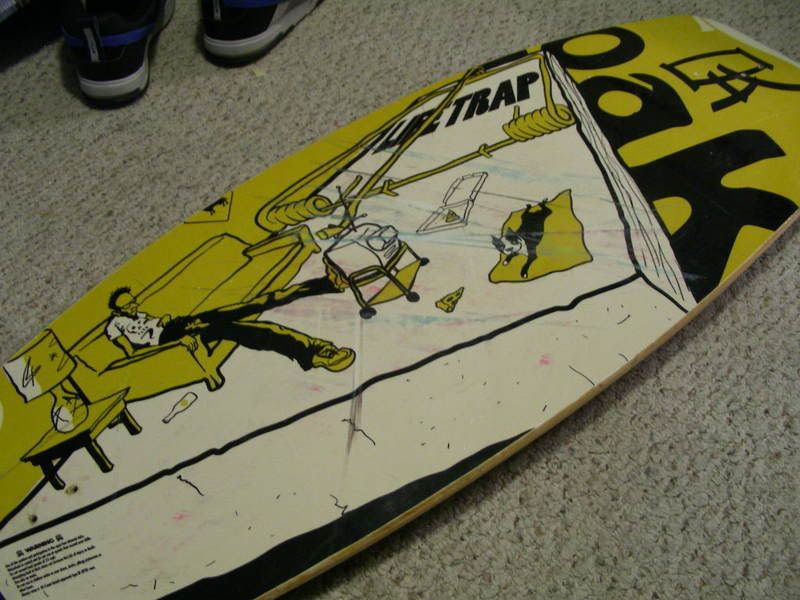 first deck i got was this boat of a board called the vinyl, i hid ridden other boards(mainly 06 impulses), and decided i wanted to get a board, didnt know what to get, so i got this, landed my first shuv on it and i was hooked, and i've only strapped twice since then haha