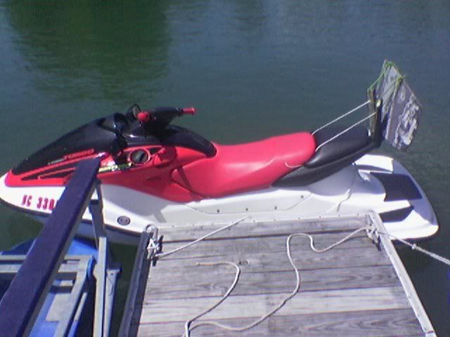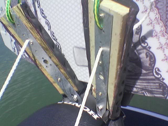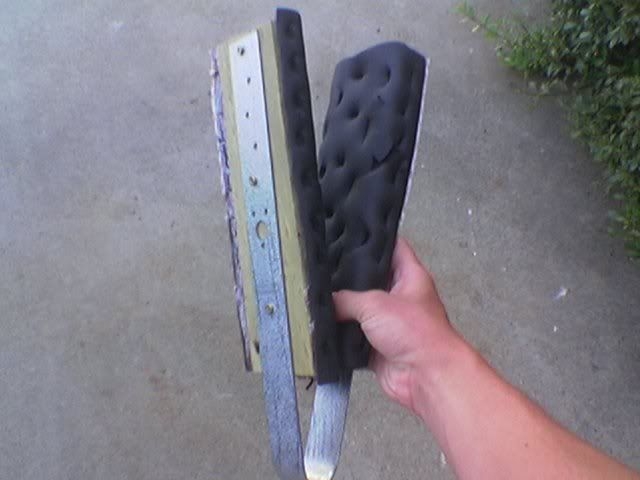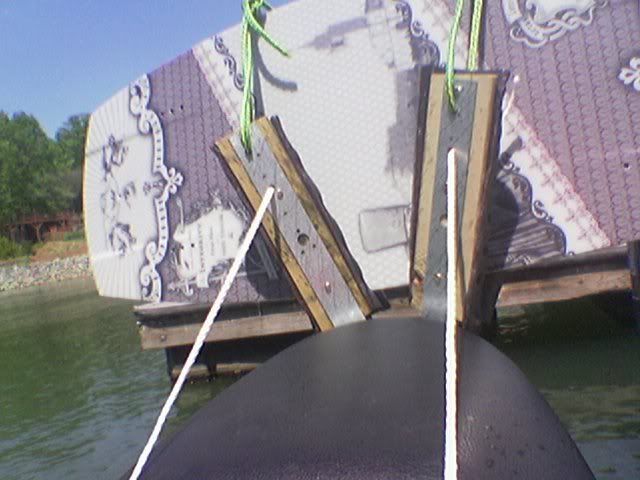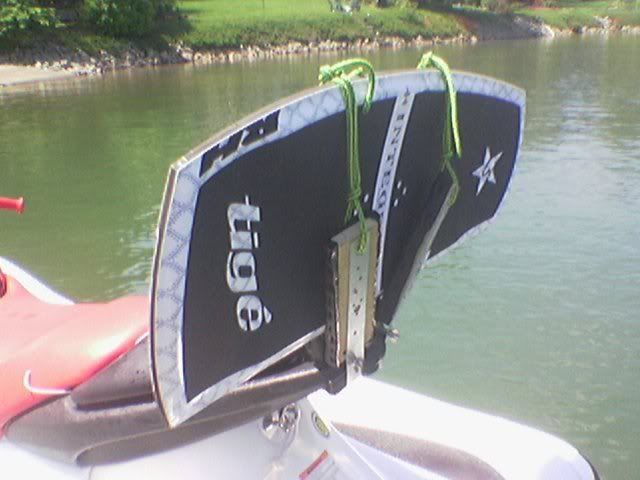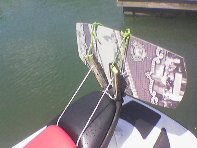 well i got tired of having to always sit on my wakeskate when riding around or pulling someone that used a different wakeskate or wakeboard or w/e and i have a honda so i dont have the sea-doo wakeboard rack option so i decided to make my own. it cost me a whole 20 bucks. it works perfectly fine for how cheapy it is. and i know it looks crappy but i have to get new rope and finish padding the holders. here it is: