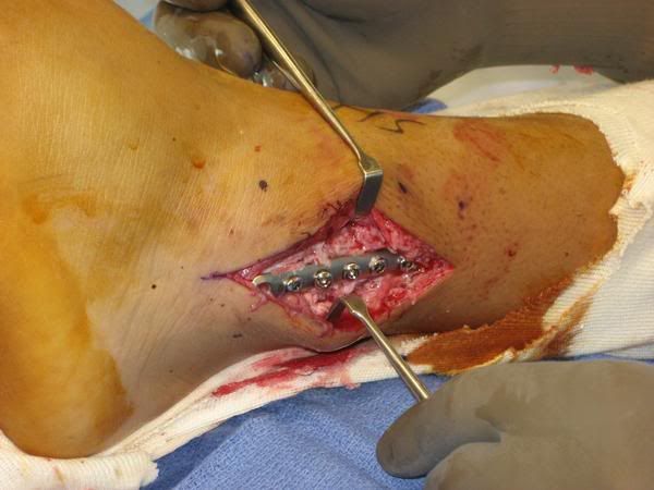 electricsnow, the tibia was completely snaped in half so originaly they where going to give me a bone marrow graph and complete it with a plate and screws, but they cut it open and realized i tore the ligament holding the tibia and fibula together or sumthing and had to put aother screw holding it together, it all it sucks.