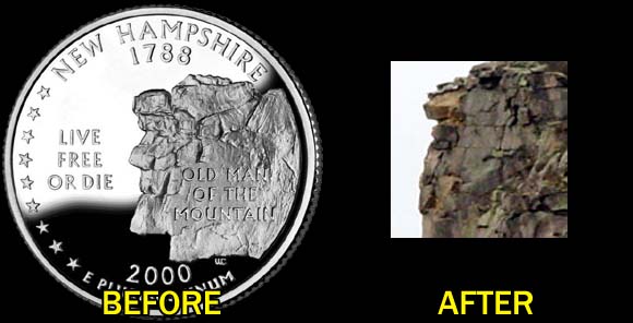 Idaho's state colors are: red, white, and boring. I'd go so far as to say that Idaho is the most boring state in the union. Though, I have to admit that I've never been to New Hampshire, where the most interesting thing that state has/had going for it is the formation of a cliff that kind of looked like the face of an old man when viewed from a certain angle. New Hampshire is so boring that they literally put this arbitrary geological formation on their state coin. The "face" finally collapsed in 2003, causing many to be so distressed that they literally cried: