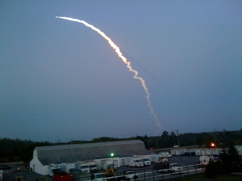 It was pretty amazing. Living in Orlando, I get to see the shuttle everytime (assuming I'm outside) and I have to say yesterday's launch was one of my favorites. It launched minutes after sunset when there was still light in the sky. Because the sun had just set when it was launched, the higher up the shuttle went, the more red the trailing smoke was... until it got really high up and was in direct sunlight, then the smoke looked like a glowing white cloud. Sorry there isn't a pic of the white cloud, but here's the right before the white cloud part: