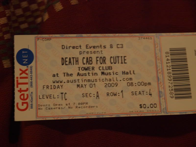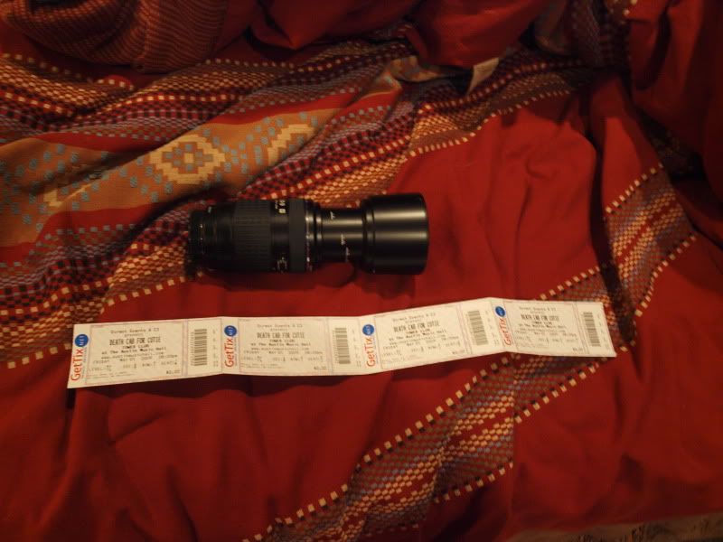 after the set walked up to the house were i was greeted by a beautiful box with a new gorgeous 70-300mm Lens (another birthday hat guy!!!!), but thats not all, those 4 tickets there in the pic are to Death Cab for Cutie! friday. (MEGA B-DAY hat guy)!!!