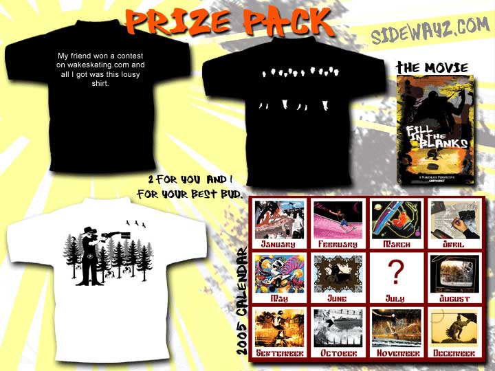 Winners will be randomly chosen from the entries with correct answers. One grand prize winner will win the Sidewayz Prize Pack. Two more lucky winners will win a "Fill In The Blanks" DVD. Winners will be announced on Wakeskating.com and will also be notified by email.